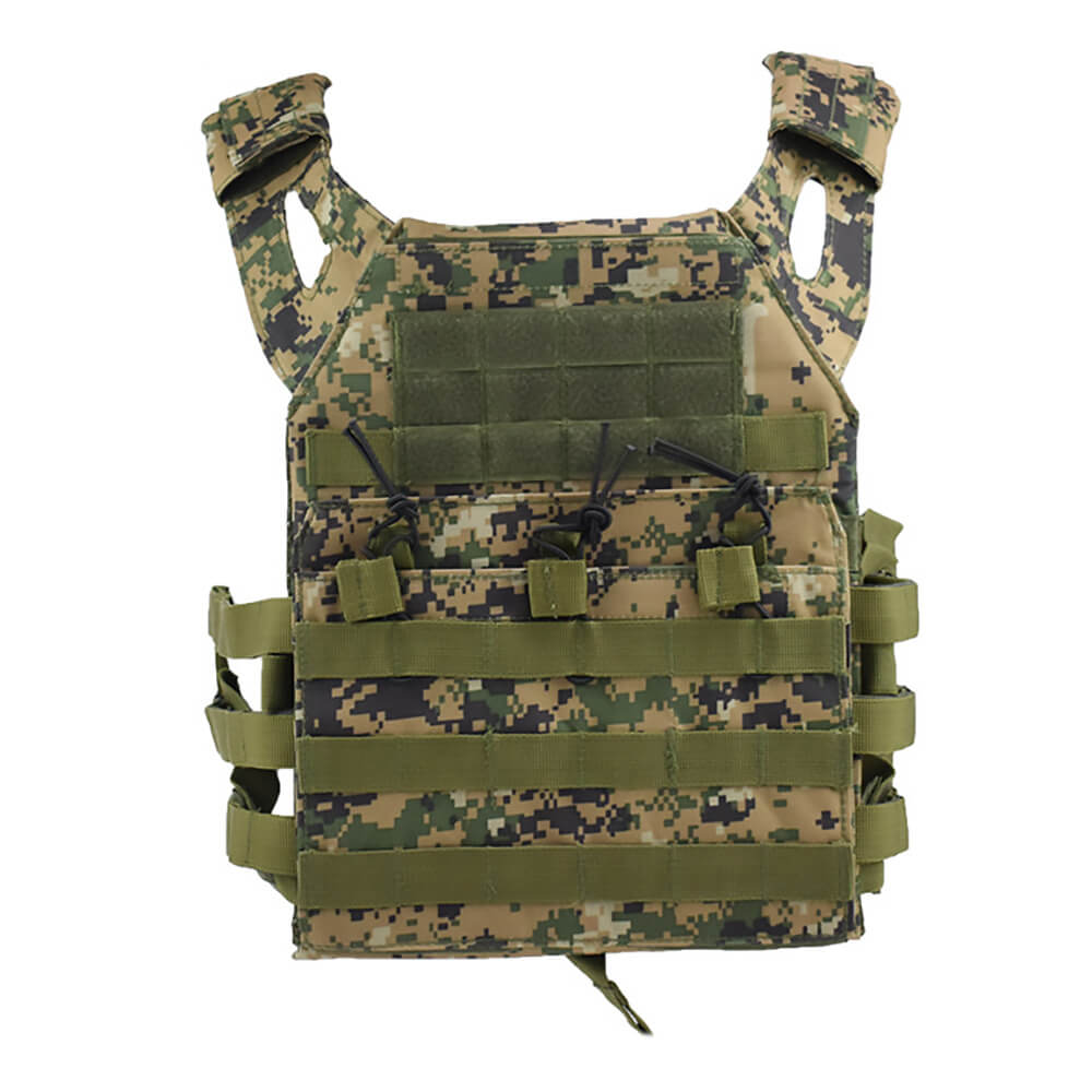 Тактический жилет JPC с двумя ПЭ пластинами Digital jungle армейский используется для защиты человека от пуль, ножевых ранений. Военный жилет изготовлен из прочной ткани Оксфорд, не боится дождя, загрязнений и снега. Размеры бронежилета с пластинами регулируются по фигуре за счет эластичных резинок по всей поверхности. Боевой бронежилет имеет широкие лямки для плеч, благодаря которым нагрузка распределяется равномерно по всему корпусу. Тактический жилет с пластинами выполнен в песочном цвете хаки, за счет чего хорошо сливается с опавшей листвой. Жилет подходит для ношения летом, весной и осенью.